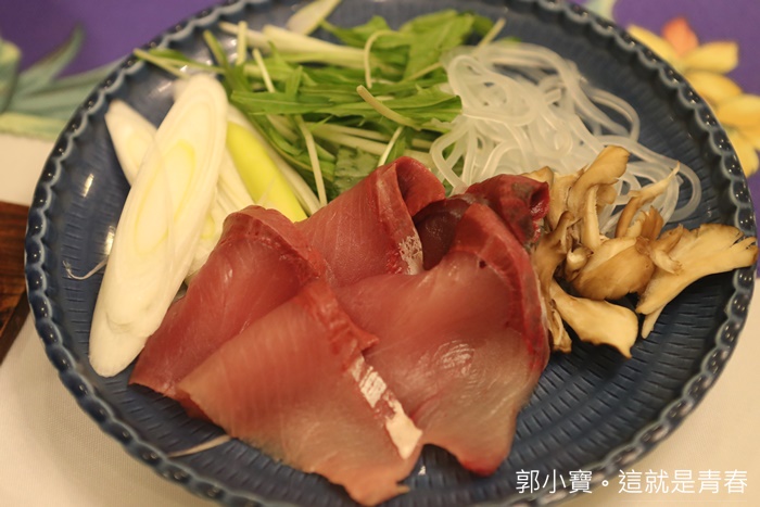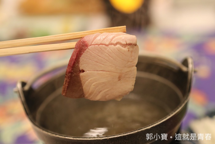 | 看起來似乎是熟成過的生魚片,店家還準備了一個涮涮鍋,如果不敢吃生食的話,可以放到鍋裡面涮個兩三秒,我個人直接吃覺得很好吃,與一般的生魚片不同,有股甘甜味。 |