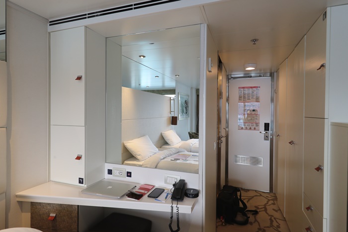| 我比較佩服的是他們房間的巧思,雖然不像一般飯店空間的大,但是麻雀雖小卻是應有盡有,而且都不感覺到擁擠,配置的剛剛好,梳妝台的桌子還可以放上15吋筆電輕鬆打電腦以外,重點是鏡子很大一片,也不用擔心光線不足,在海上最充足的就是光線了,只要把窗簾打開保證有滿滿的陽光。 |