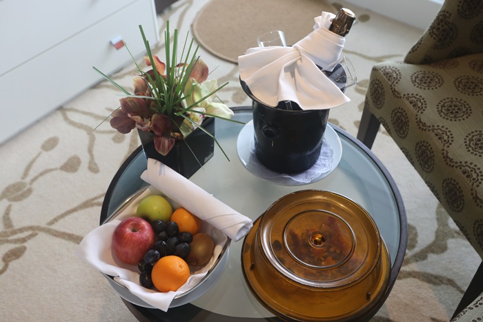 | 一進門就可以看到點心下午茶跟水果,還有一瓶免費香檳,後面幾天都會換上不同的水果,還滿讚的。 |