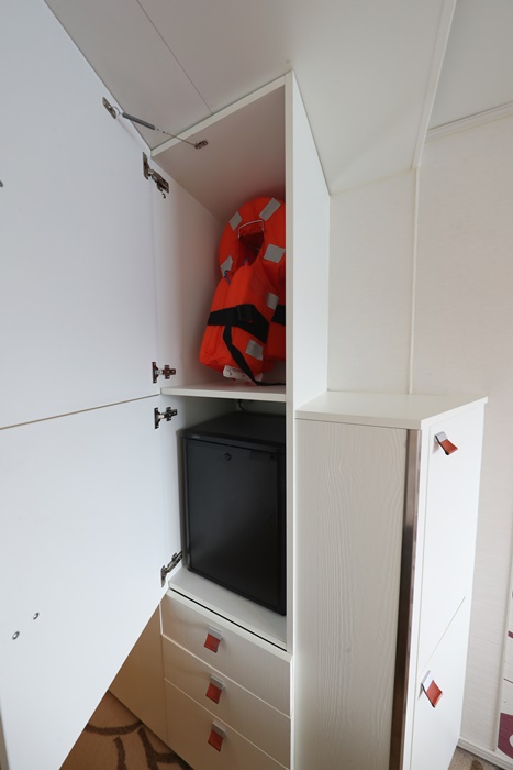 | 冰箱跟救生衣都在最右邊的櫃子裡,底下還有櫃子跟抽屜可以運用,不管妳行李箱裡面帶了多少衣服跟東西,這些收納空間絕對都可以滿足妳,加上妳在日本採購的商品,保證妳都可以塞好塞滿XD |
