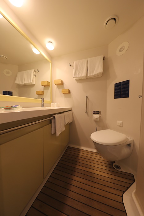 | 廁所空間也滿大的,而且沒有甚麼潮濕的霉味,整個廁所看起來也保持跟維持得很好,而且還帶點設計感,因為COSTA歌詩達郵輪沒有提供牙膏根牙刷,所以記得自備牙膏牙刷,馬桶是懸吊式馬桶,以我胖子的體重坐上去都沒有垮了,所以其他人應該也不用太擔心,洗手台相當大,還夠我放其他的雜物。 |