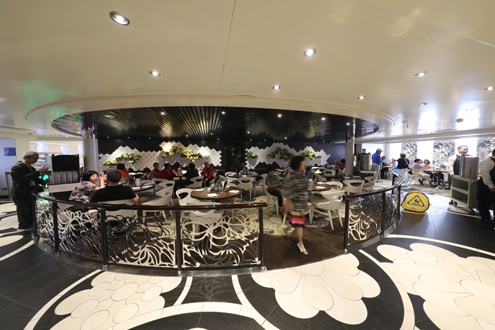 | 這個地方是披薩屋,也是晚上的另一個付費餐廳,平常是大家吃飯的空間,說到這餐廳不得不先跟大家報告一下,全球唯一郵輪上有明火的地方就是這裡了,最正統的義大利披薩在這邊就可以品嘗到,光是郵輪上有明火這一點就超屌的,工作人員說他們花了超多錢才通過檢測跟SOP,如果喜歡看帥哥的話,晚上來這邊可以看到許多國外的船員在這邊聊天吃飯。 |