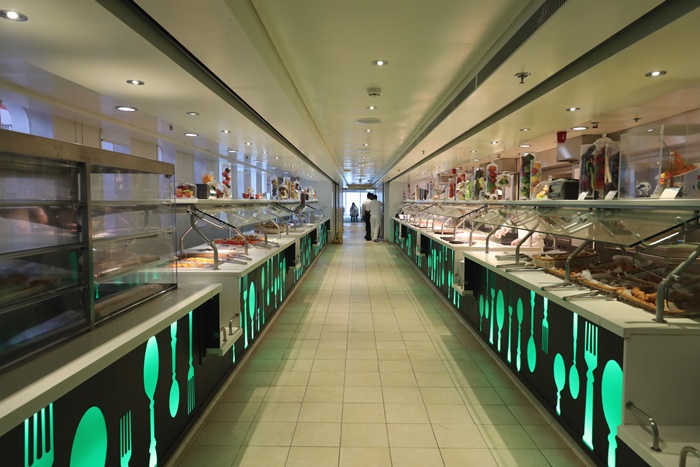 | 自助吧餐廳左右各有有一個長廊,所以兩邊都可以排隊取餐,大幅的減少了取餐排隊的時間,餐廳的空間相當的大,從船尾到泳池畔都是可以用餐的空間,看妳喜歡在哪吃就在哪吃,廚師們補餐的速度相當的快,所以不要搶先恐後,絕對都可以讓你吃到飽飽的,台灣人真的很怕吃不到很愛插隊QQ |