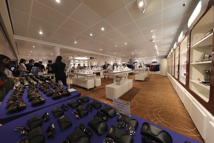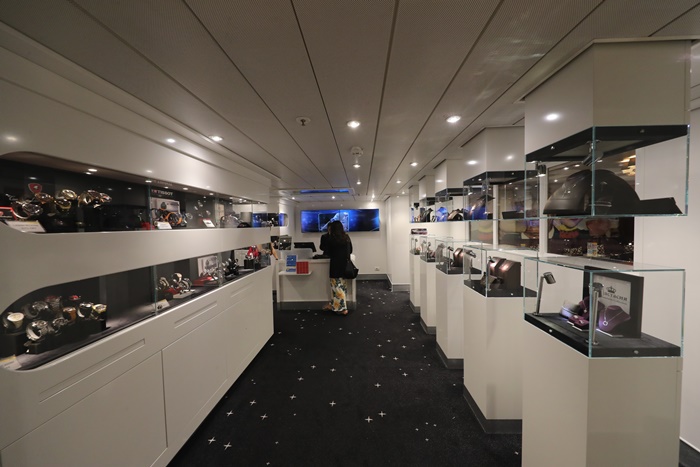 | 大家最喜歡的購物中心免稅店,只要一到達公海後,免稅店就會打開門迎接瘋狂採購的消費者門,這就是為什麼我一開頭就要大家千萬別忘記拿房卡去綁定信用卡,因為這免稅店真的太好買了,手錶專賣店跟菸酒專賣店還有香水專賣店,除了這些以外還有包包跟墨鏡、首飾等等,而且重點有時候還會廣播限時搶購,真的超刺激的,一聽到廣播全部的人就會狂衝狂搶,貞的一不小心就會瞬間手滑,我買了一對施華洛世奇的耳環也才10美金,是不是超級便宜的! |