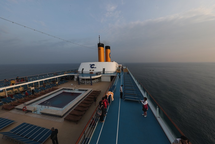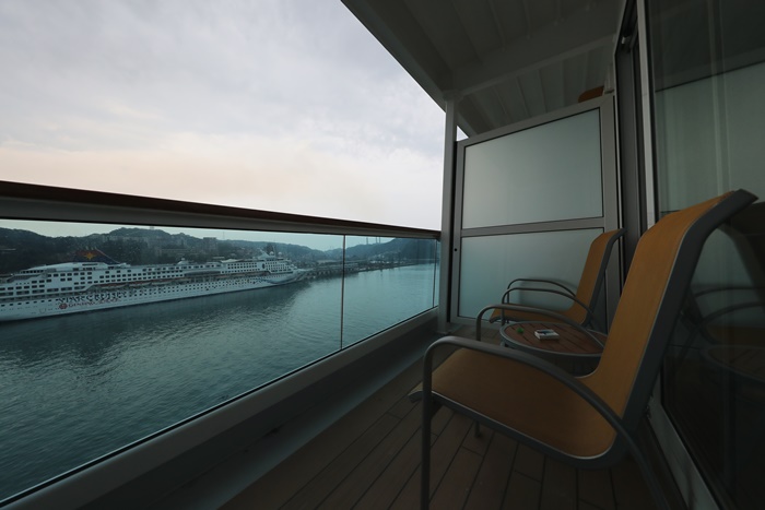 | 我最愛的就是這陽台,COSTA歌詩達郵輪的海景房真的超威的,除了房間內的裝潢超漂亮以外,這陽台也超受歡迎的,玻璃帷幕的柵欄讓質感翻倍,坐在這邊享受夕陽或日出都是人生一大享受,享受海風的吹撫真的非常舒服愜意,我這六天有空幾乎都在這邊度過,聽著音樂喝著咖啡跟香檳,非常悠閒的放鬆。 |