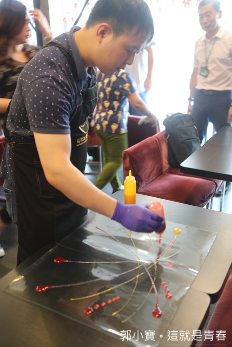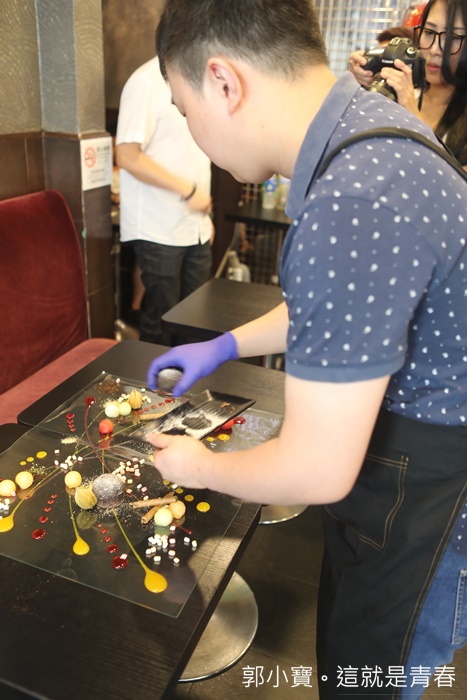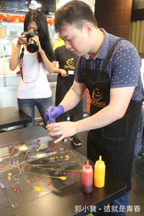 | 接下來老闆就開始搬動桌椅,合併了兩張桌子說要替我們展示前陣子參賽得獎的作品,是一道很即興的冰品。 |