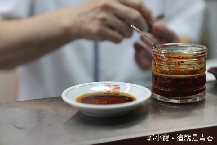 | 老爺爺特別比手畫腳跟我推薦一定要沾他們家的辣油,似乎是小洞天的招牌醬料。 |