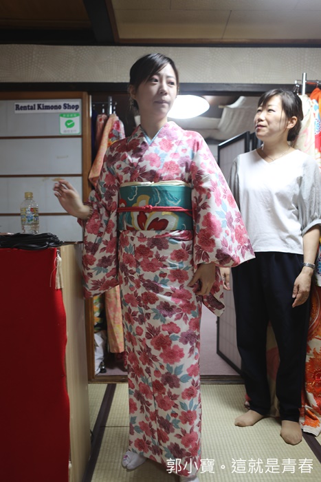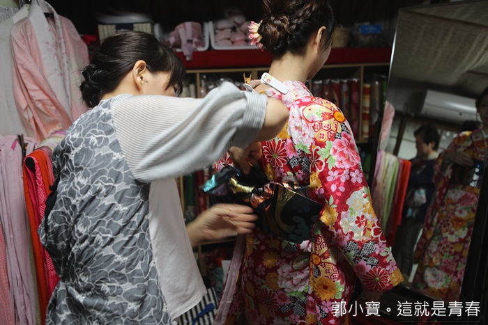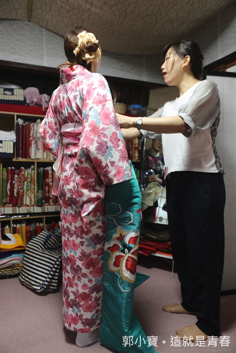 第二天太妃又吵著要去骨董和服出租店租另一套,這次我就有比較完整的拍到換和服的過程,其實工程真的很浩大,兩個人真的很專業,我以為和服就穿起來綁起來那麼簡單,看到兩位大姐為了把和服拉出好看的弧度跟袖口,反覆快速的抓了幾次距離就定型。
