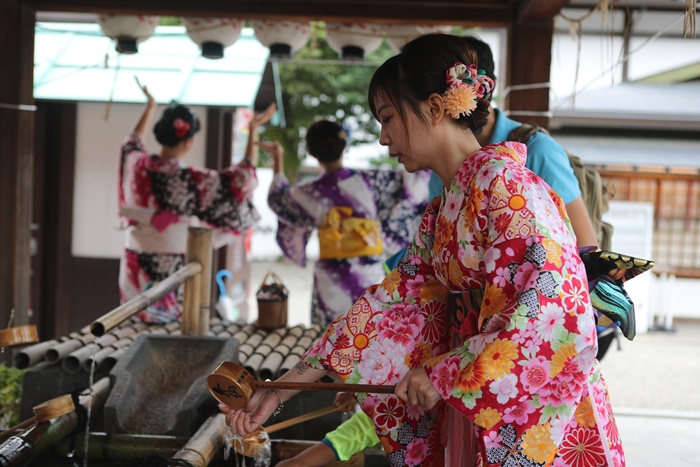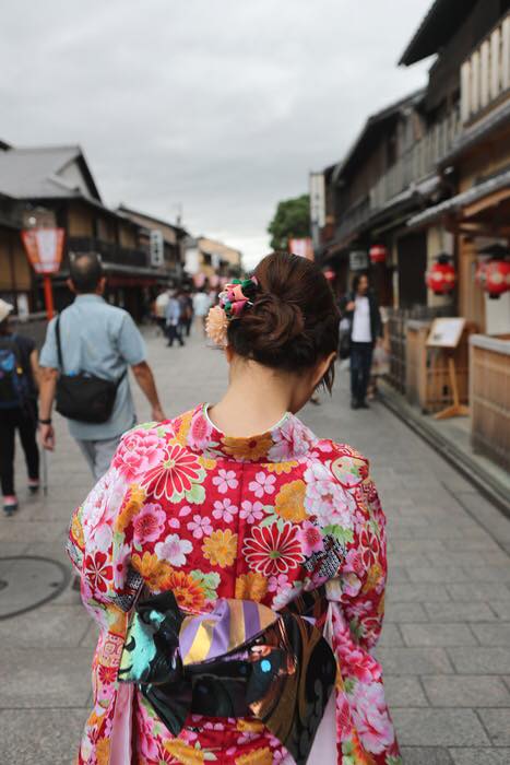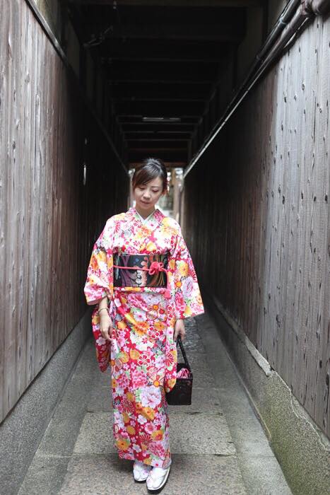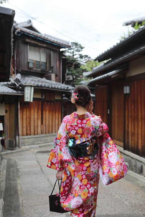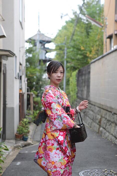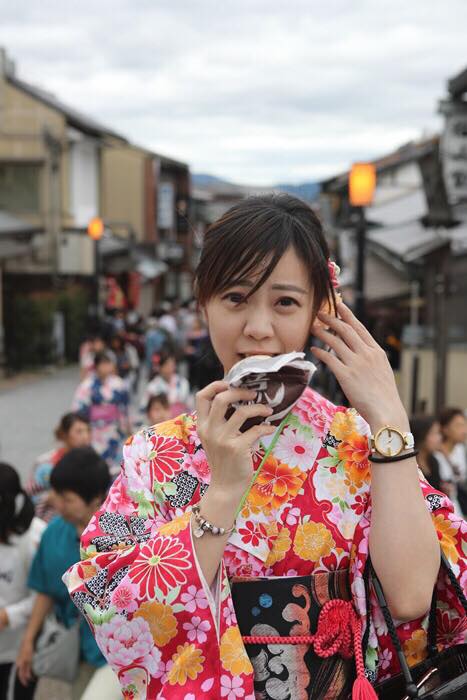 | 第二天換好直上清水坂,清水坂基本上就是和服聚集地了,真的可以比比看穿起來的感覺跟質感,骨董和服出租店的整體質感不管是和服、綁帶、腰花等等都立馬分出高下,對比其他人的配件、跟其他細節真的差很多,經過這次我才知道原來和服也可以落差那麼大,後來跟大姊聊天後才知道,原來他們公司本來就有做古董和服買賣,它們買賣的都是上百萬的超高級和服,難怪可以對和服那麼了解! |