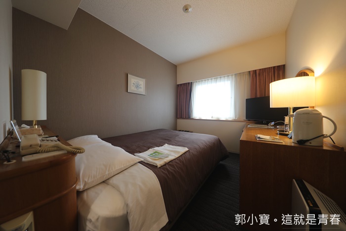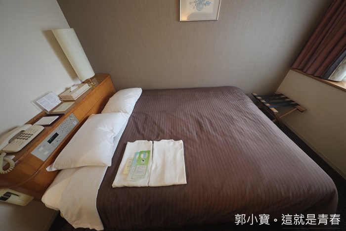 | 房間的空間不會很大,就是日本商務旅館可以想像出來的空間,但是比起精華中心其他商務旅館比起來這邊空間算是好活動許多,標準尺寸的雙人床以外,還有茶几書桌通通都再一起,床腳的部分放置兩個行李箱還沒有甚麼大問題。 |