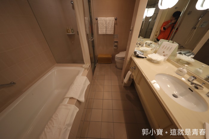 | 廁所的部分也超大一間的,浴缸是大浴缸可以整個人躺下去都沒問題,旁邊還有淋浴間跟免治馬桶,洗手台非常大。 |
