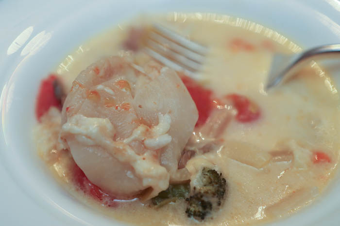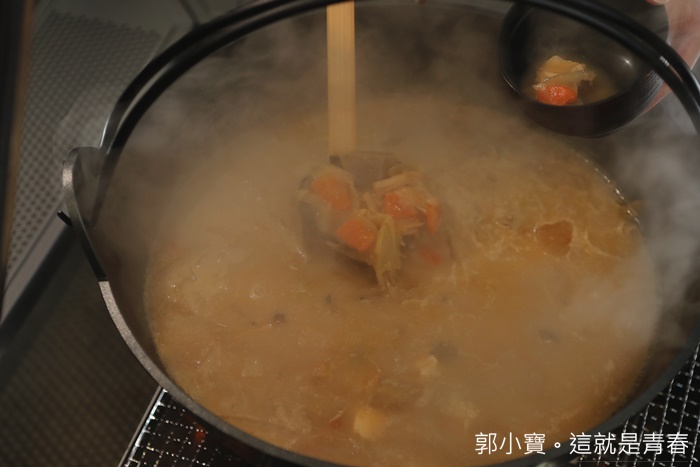 | 起司海鮮鍋一上來的時候大家都瘋狂了,還沒開動就可以聞到那陣陣隨著鍋裡滾燙的白煙冒出來的起司奶油香氣,搭配超大顆的新鮮大干貝真的太滿足了,每一口都溫暖了這個寒冷的夜。 |