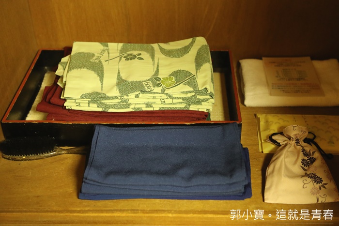 | 衣櫃裡面有浴衣跟盥洗用品,盥洗包是要帶去大浴場使用的,如果浴衣不合身的話,一樓大廳還有其他尺寸。 |
