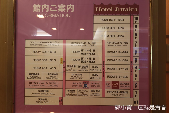 | 後來看了案內圖才發現,聚樂溫泉旅館是三棟建築物連在一起的,大廳在二樓,一樓以下的部份都是以大眾泡湯區為主。 |