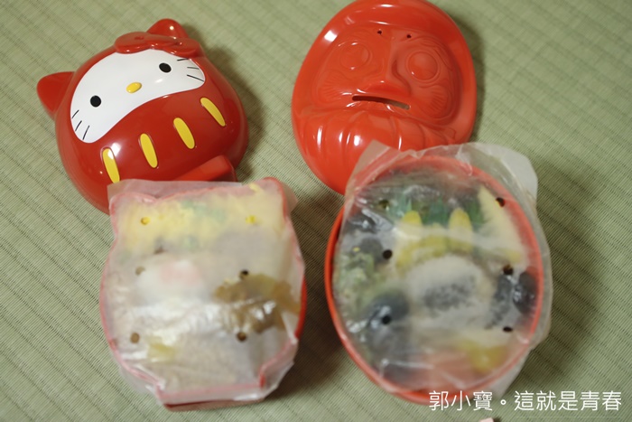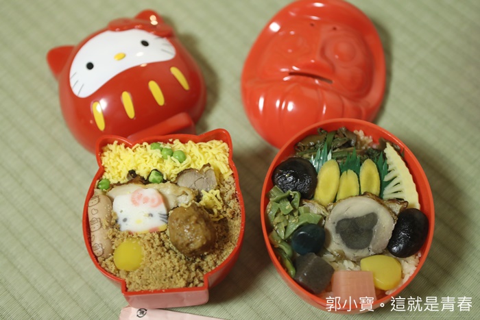 | 一整個也是超級豐富的便當,但是其實這兩個便當對我來說最重要的還是便當盒,吃完洗乾淨還可以重複使用,達摩便當最主要是要讓小朋友自己在便當蓋上面畫上眼睛,不然也可以當存錢筒,嘴巴開洞的地方就是投幣的地方。 |