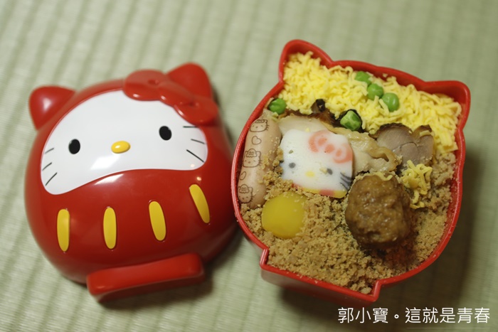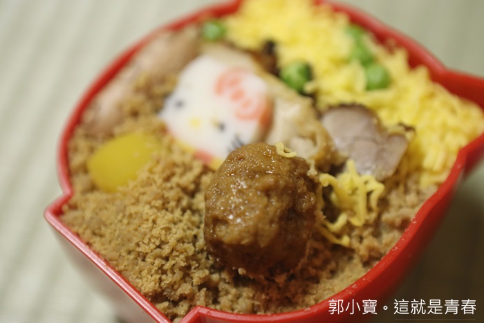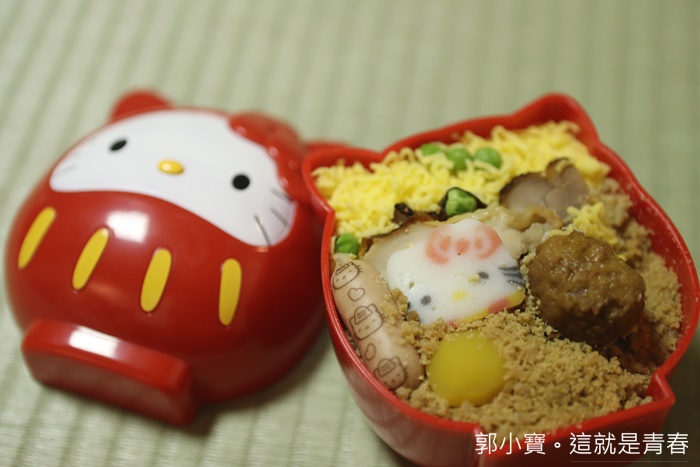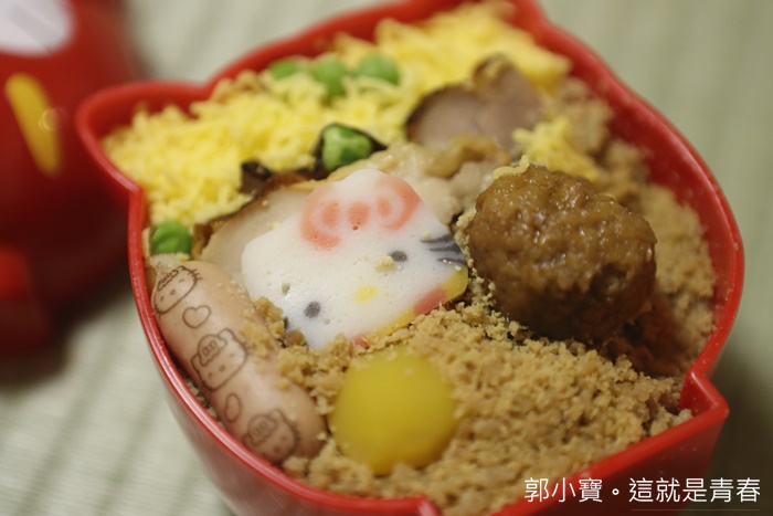| 菜色非常豐富,一個女生一定可以吃飽,重點連裡面的食材都是KITTY,滿滿的KITTY真的用看的就一整個視覺上的大享受了,蛋絲加上魚鬆還有肉丸子都很下飯,kitty魚板真的好捨不得下肚。 |