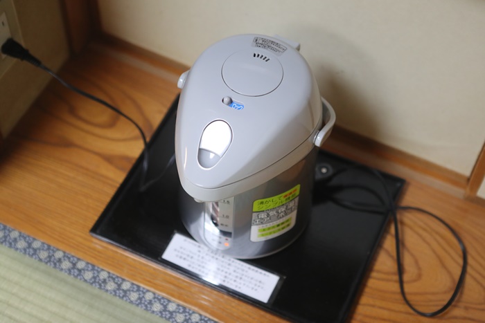 | 茶水桌旁邊還有茶組盒,打開後就可以看到一整套的茶具,茶具還滿完整的,跟一般日式旅館提供的簡易茶具還是有差別的。 |