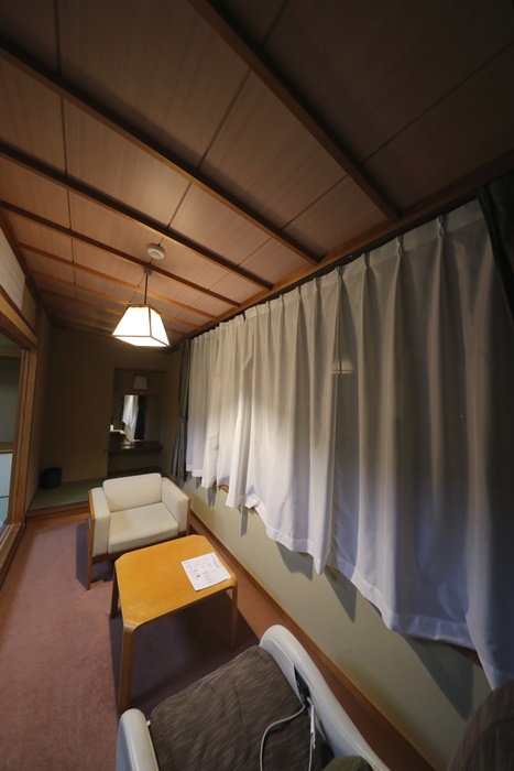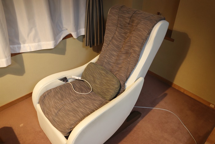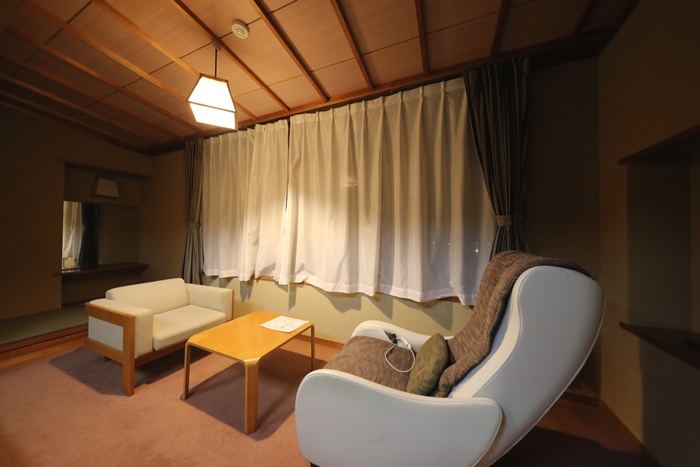 | 窗戶旁邊還有一個休憩區,可以坐在這邊欣賞窗外的景色,佐渡的旅館窗外大多都有美好的景色或是海岸景色,比較特別的是其中一個椅子還是按摩椅,按摩椅是簡易的按摩椅,泡完溫泉後坐在這邊按摩一下很舒服呢。 |