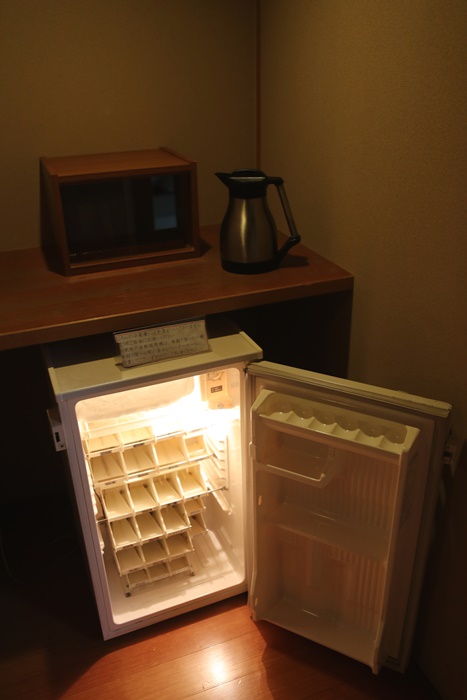 | 入口處玄關就有一台冰箱,冰箱內的分隔層是可以一格一格放置飲料根啤酒的,方便大家存放飲料,這樣的設計我覺得在日本非常實用,冰箱櫃上則是已經裝好的一整壺的熱開水,另外還有啤酒杯。 |