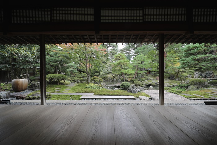 | 主建築的另一個門口對面的庭園也超美的,不過這個門口目前沒有開放,這個地方除了子騰季節以外,最多人潮就是楓葉的季節,搭配建築一整個美到了極點。 |