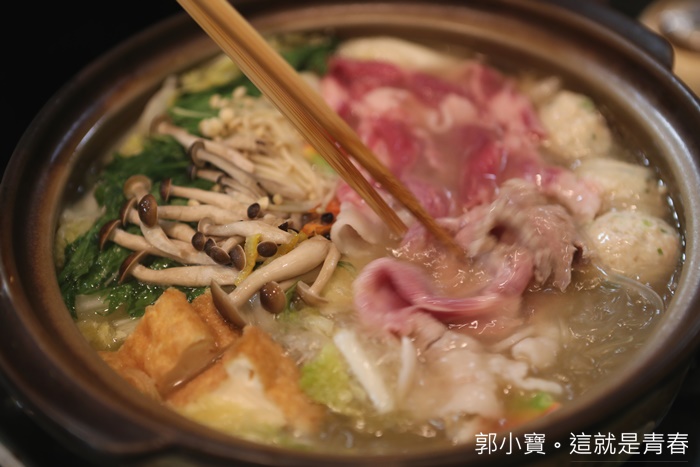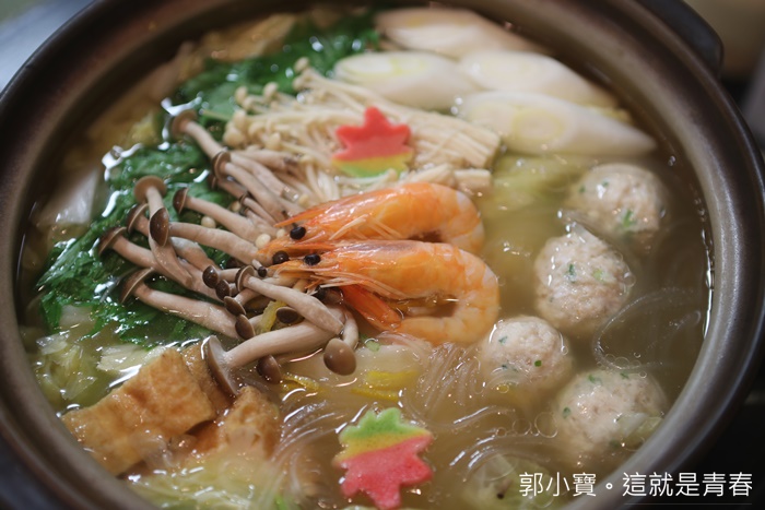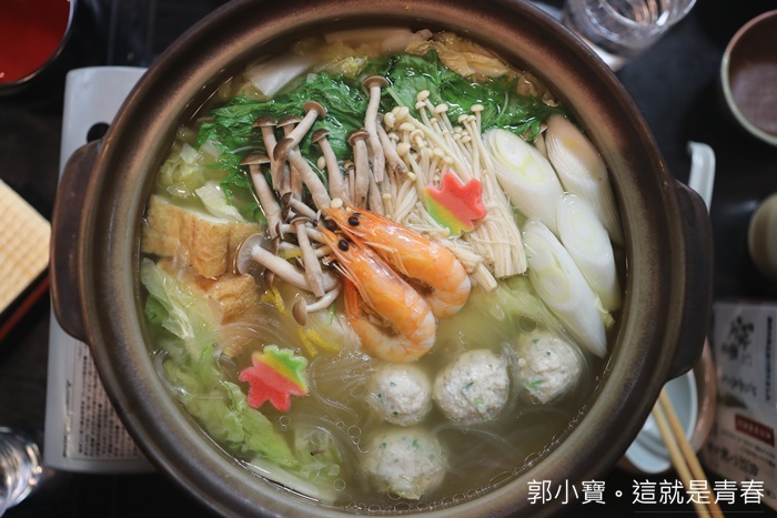 | 砂鍋的部份本身就熬煮好了,裡面的食材本身就很多,所以單價也比涮涮鍋多了1000日幣,裡面除了蔬菜以外還有多了各種魚板根丸子,還有一些海鮮配料非常豐富。 |