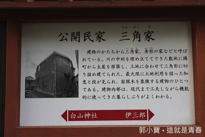 | 最不能錯過的就是這一家三角屋,算是宿根木的代表性建築,因為當初宿根木是沒有在規劃下造鎮造起來的,所以不管是道路還是建築都是就地直接就蓋了,所以形成了這邊的房屋很多都不是四四方方的,所以才更顯得這些木匠及船匠的工藝,也因為船匠的關係才能有這樣的三角房屋出現。 |