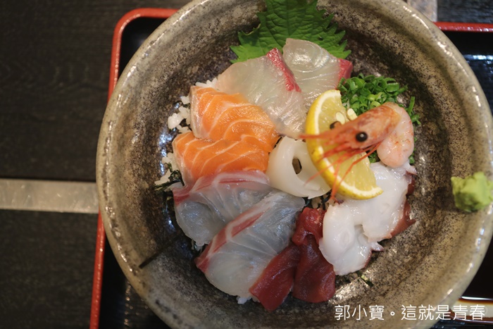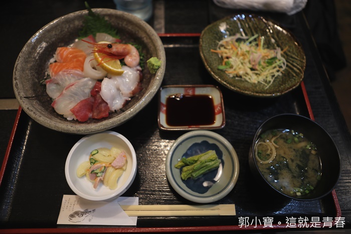 滿滿海鮮料的海鮮丼看起來真的還滿豐盛的,重點在日本這樣的海鮮丼才賣1000多日幣真的很划算,四種生魚片還有一隻甜蝦跟章魚、花枝我覺得還滿划算的,新鮮度也都很不錯,飯量不多但是吃起來挺滿足的。