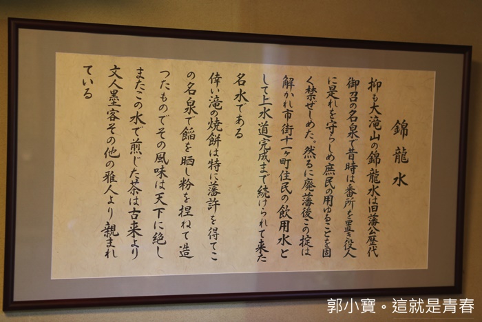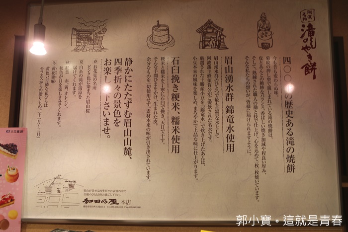 | 一旁牆上掛著瀧之燒餅的原物料簡介,不管是米還是水都是大有來歷。 |
