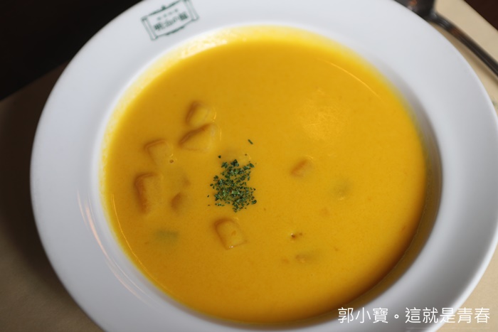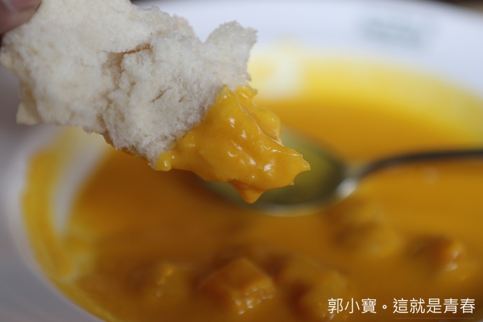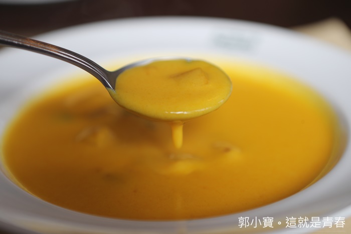| 不得不稱讚一下這南瓜濃湯,南瓜濃郁的香氣真的直衝喉嚨以外,喝起來又不會膩口,沾麵包跟單喝都很美味。 |