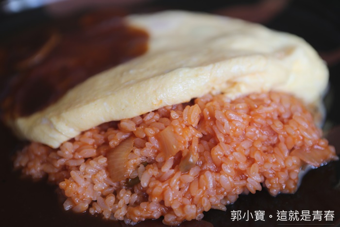 | 從側面看看那歐姆蛋的厚度真的很療癒,下面鋪的是番茄炒飯,裡面還有很多新鮮的食材拌炒,味道非常的棒,微酸帶點加上淡香真的很無敵,旁邊的蘑菇醬汁吃了一口帶點苦味,沒意外應該是牛膠醬汁,日本很多歐式蛋包飯都會搭配這種醬汁,但是他們家的更厲害,那帶點苦味但回甘層次又多變的牛膠醬汁真的很好吃。 |