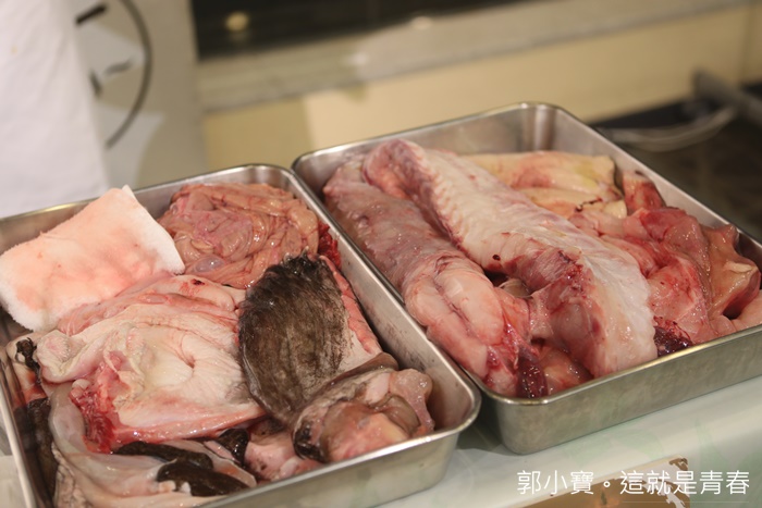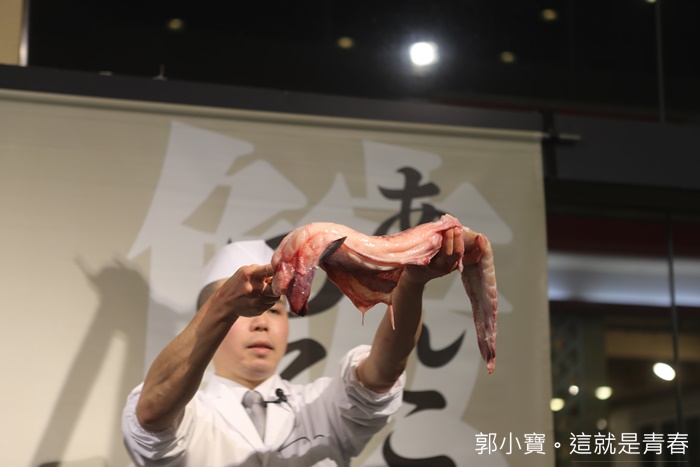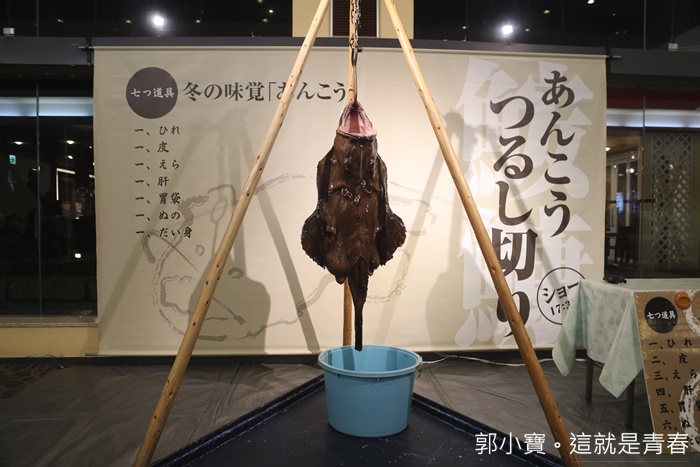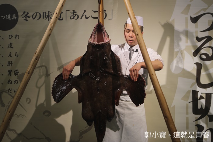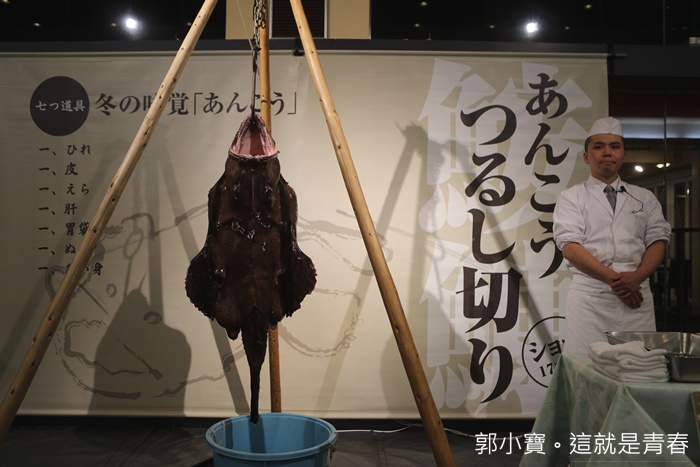 | 超大隻的鮟鱇魚活跳跳的被吊起來,廚師上場先介紹一下鮟鱇魚。 |