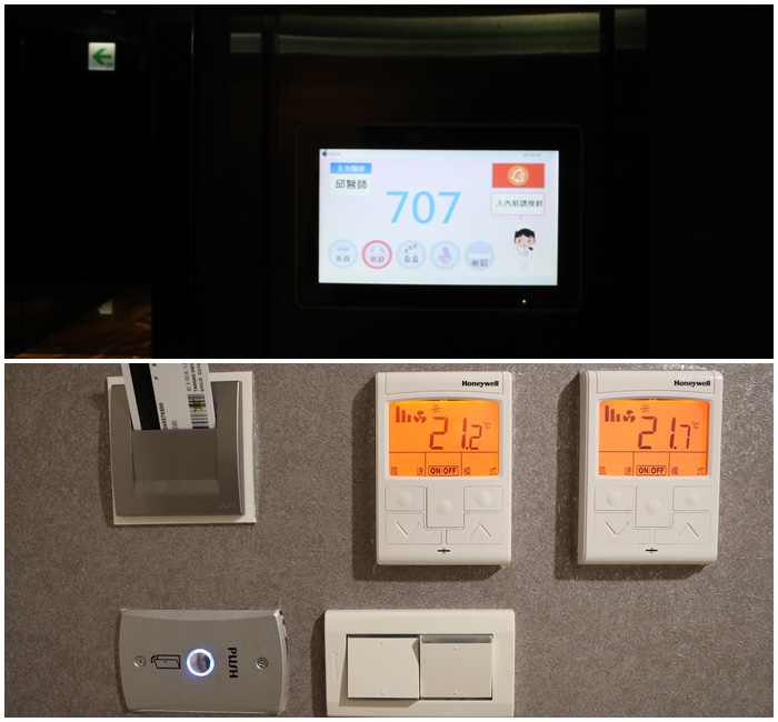 | 每個房間都還需要房門感應卡感應才可以進入,房門前的小銀幕有主治醫師的大名以外還有孕媽咪的名子,還有顯示裡面的孕媽咪現在的情況,門鈴也在這個小銀幕上唷,一進門的時候需要插卡才會通電,真的很像飯店一樣,室內空調的部分也都在牆上,空調非常夠力,夏天生產的孕媽咪也不用太擔心空調不夠力。 |