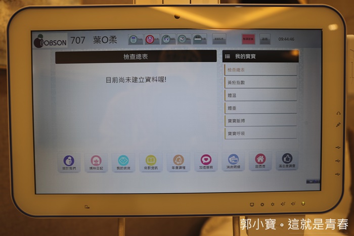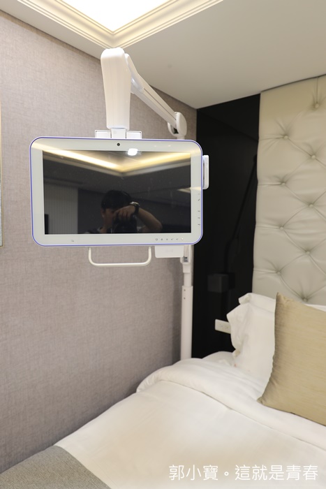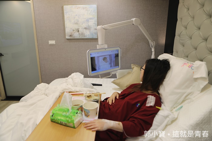 | 最引起我好奇的就是床邊的這支電腦手臂,可以隨心所欲移動到最適合自己觀看的角度,上面可以觀看在嬰兒室的寶寶動態,每天都有兩個時段可以看到寶寶,分別是早上11點跟晚上7點,每次都半小時,嬰兒也可以推上來跟母嬰同室,除了這樣以外還可以看寶寶的每天記錄,還有加值服務等選項,一指操控真的很方便,非常高檔的新設備,重點是非常實用! |