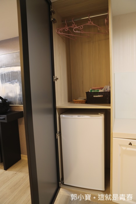 | 客廳一旁的櫃子除了有一個鞋櫃以外還有一個長型櫃,打開一看原來上方是衣櫃,下方是電冰箱,衣櫃裡面還有一些產後用品。 |