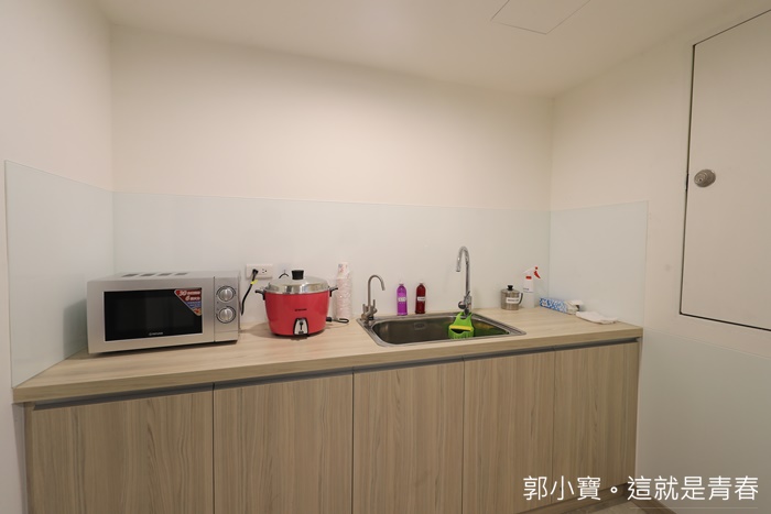 | 7樓公共空間裡面還有一個小空間,裡面有微波爐、電鍋跟滴雞精加熱杯等簡易料理器具,這邊也有免洗茶包根筷子湯匙。 |