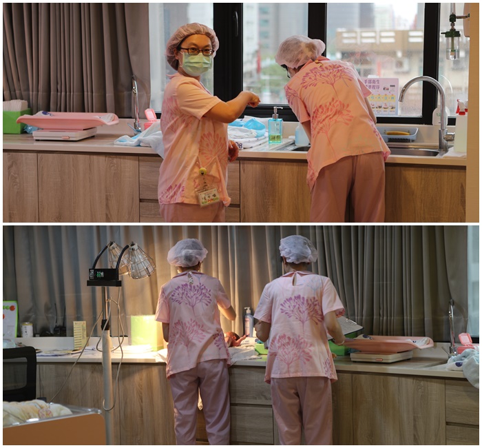| 育嬰室裡面隨時都有2~3個護理人員,孕媽咪生產完後嬰兒會先抱上來這邊讓護理人員洗澡,家人都可以透著玻璃觀看,旁邊還有一個嬰兒室的休息區,有提供免費的茶水,親友團來看小朋友也可以在這邊會客,像第一天太妃真的太累了,所以就不方便進房間,我們就都在這邊會客。 |