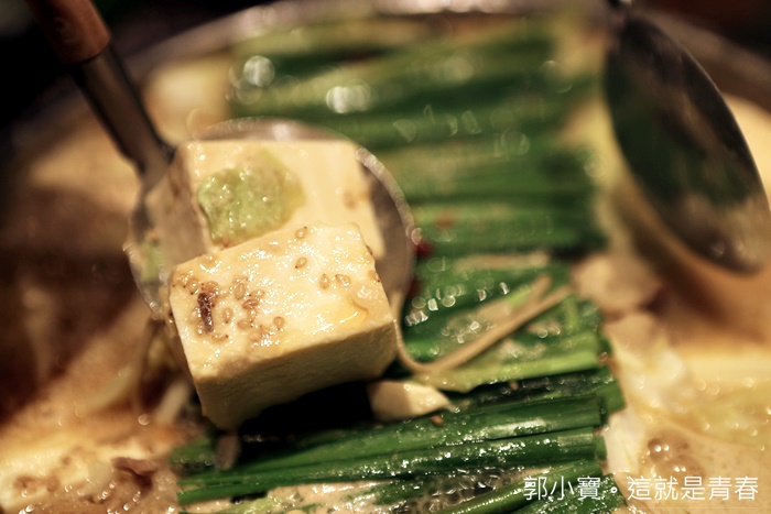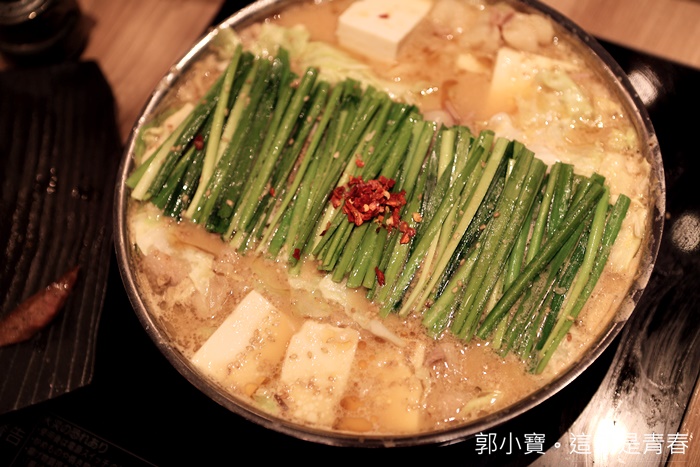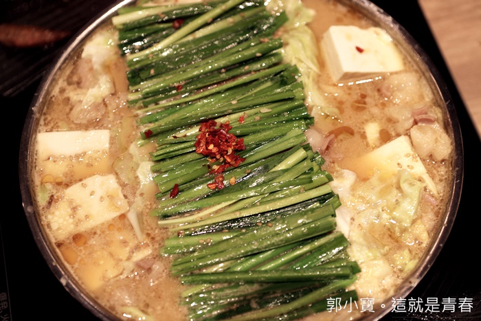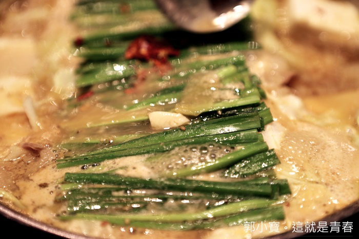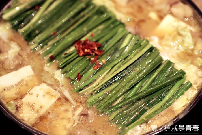 | 滾燙的內臟鍋最具有代表性的除了大腸以外,最特別的就是韭菜,大部分的內臟鍋就會配上這一樣一整排的韭菜,為什麼要搭配韭菜的道理我也不是很懂,但是韭菜其實跟味噌鍋的湯頭很搭。 |