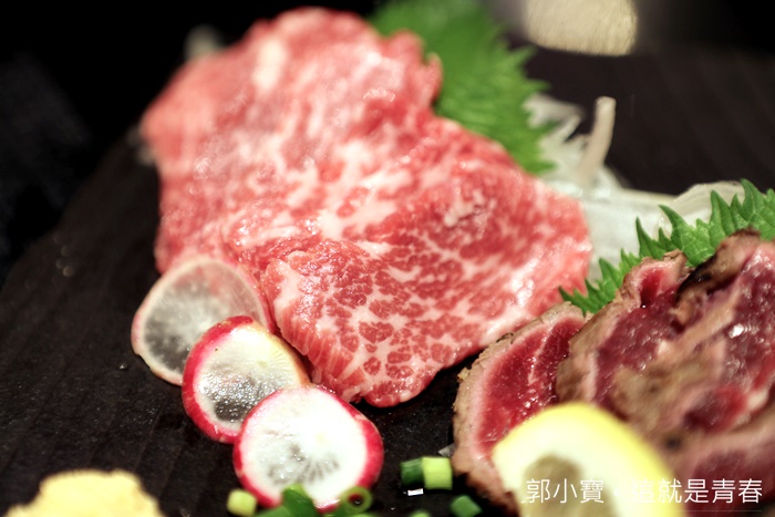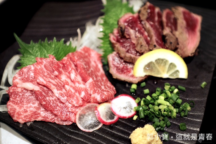 | 提供的生馬肉兩種盛,這看起來有點像是霜降的部位吃起來非常的嫩口,在口中咀嚼可以感受油花的豐沛真的還滿順口的,一點腥味都沒有,感覺真的有點像是在吃牛肉。 |