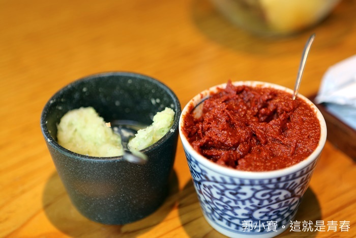 | 不管是抹上芥末還是辣醬都別有一番滋味,兩款醬我都很喜歡,吃到這時候真的只怪豬肉分量太少,每夾起一塊豬肉我都一直抉擇要吃原味還是沾芥末或者辣醬。 |