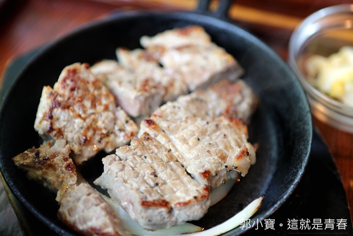 | 接下來就是在鐵鍋上滋滋作響的主角豬排了,烤豬排的分量滿足的,看起來也很可口,但是一切還是要等放到口中才能見分曉。 |
