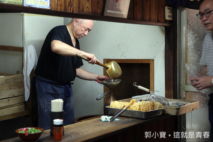 | 老闆除了要煮麵以外還要炸天婦羅,福岡的烏龍麵都是搭配天婦羅的,到福岡任何一家烏龍麵幾乎招牌都是牛蒡天婦羅烏龍麵,但是每一家天婦羅的口感跟呈現的方式都略有不同。 |