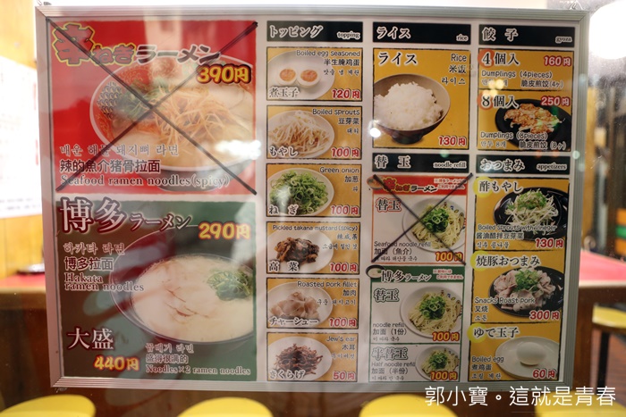 | 看看這價目表真的會讓人大吃一驚,一碗豚骨拉麵只要290日幣也太便宜了,據說這還是漲價後的價錢,真無法想像以前是賣多便宜,店內除了販售拉麵以外當然也有賣燒餃子。 |