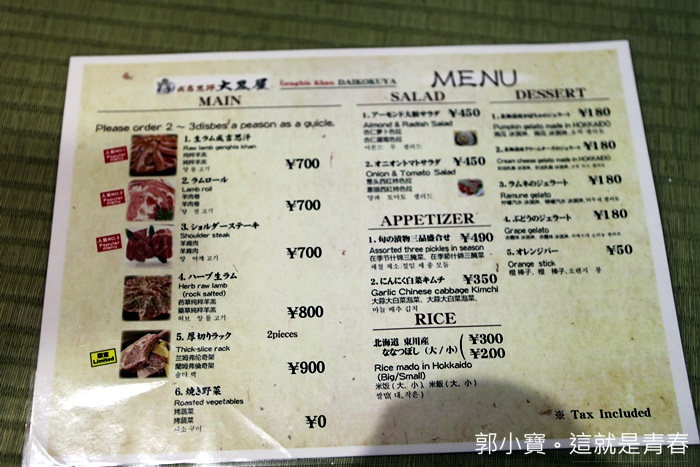 | 大黑屋最主要的三款肉品羔羊排、羊肉捲、羊肩肉單點都是700日幣,除非妳點的是有撒上藥粉的品項,不然很多都會一起裝盤。 |