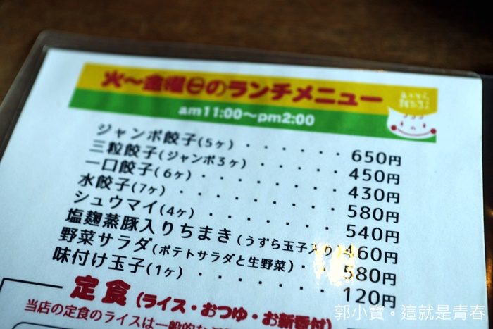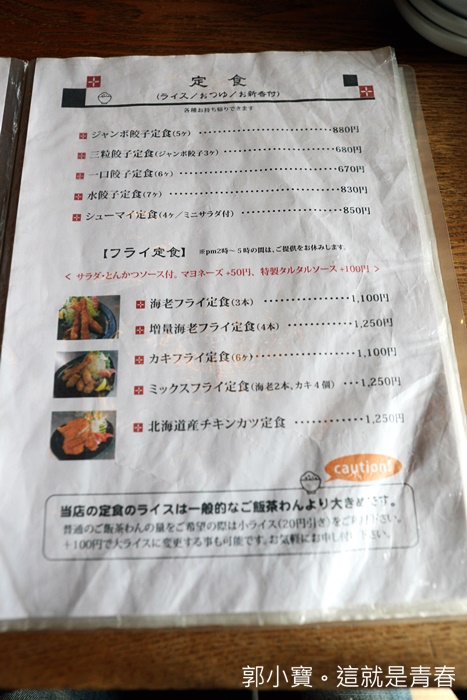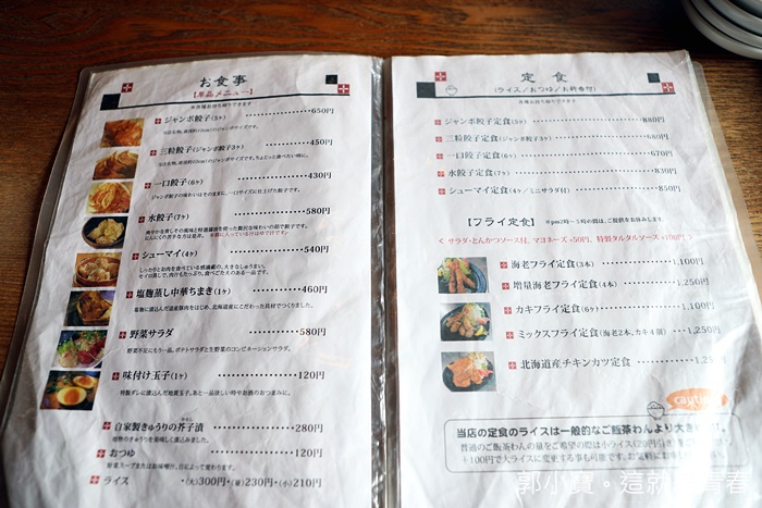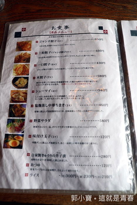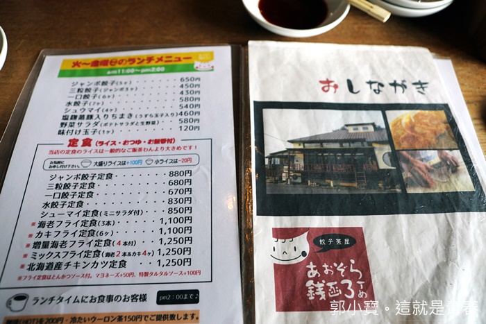 | 青空餃子茶屋除了販售餃子以外,還有其他餐點,比較妙的就是還有港式燒賣等商品,不管妳要煎餃、水餃、餃類的通通都有,青空餃子在餐廳被日本人分類為中華茶屋,餃子的尺寸也有分類,有巨無霸餃跟正常的餃子還有一口餃。 |