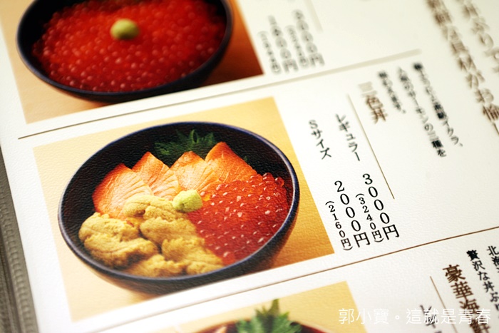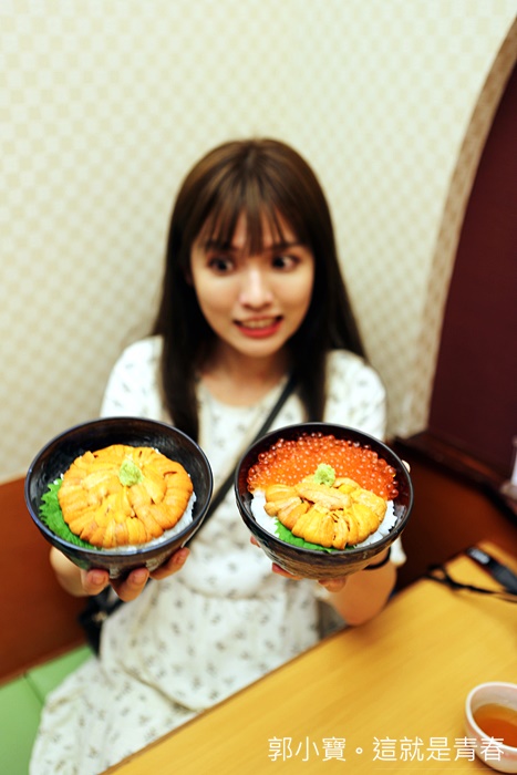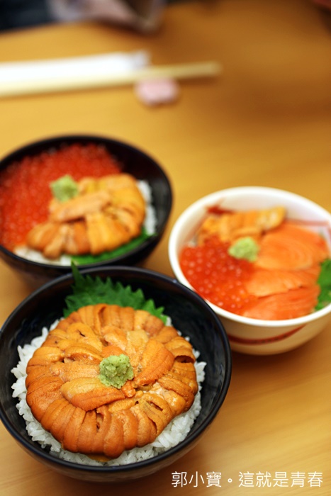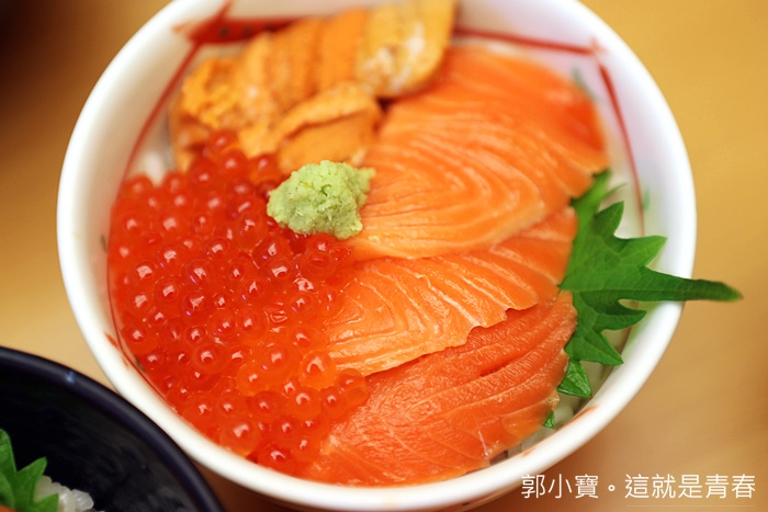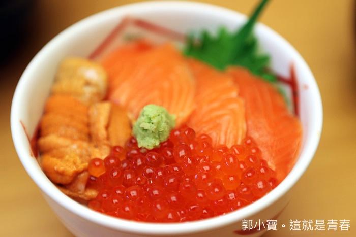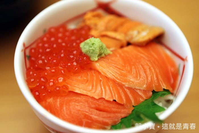 我家太妃點的三色丼,除了海膽跟鮭魚卵以外還有鮭魚生魚片,鮭魚的顏色超級漂亮的,這三種食材顏色都很像,老婆點的這一碗是小碗的,真的跟比飯碗還要小一點點,但是拍照拍起來都超滿超豐富的阿,如果有預算考量的話建議點小碗的來過過癮一樣很滿足。