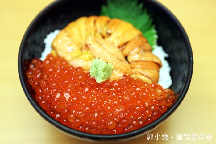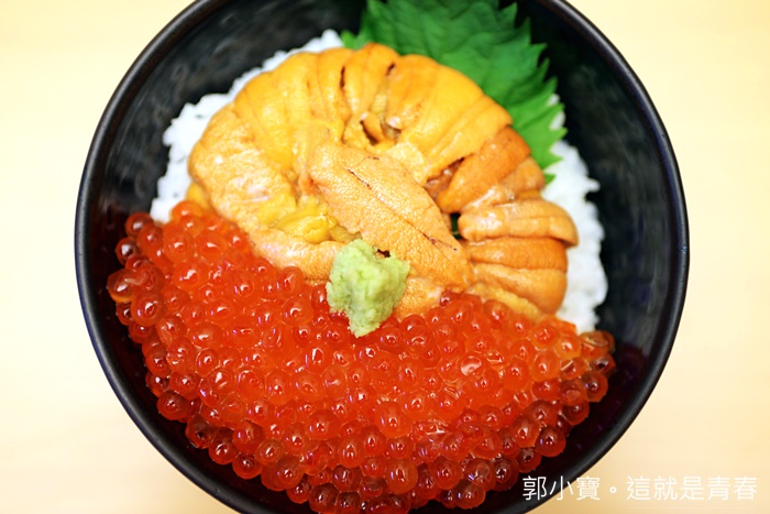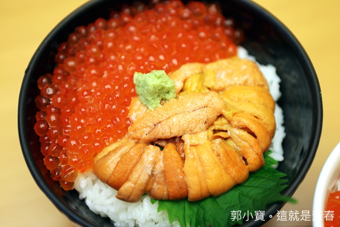 | 友人點的雙色丼,雙色丼有兩種組合,朋友選的是海膽搭配鮭魚卵,因為他愛海膽也很愛鮭魚卵,所以就給他點了這雙色丼的組合,兩大海鮮一次滿足。 |