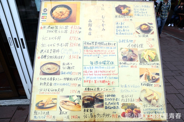 函館是很多人來北海道一定要衝的城市,而且函館還有一個全球知名的千萬夜景,當然還有函館的海鮮市場也是大家避衝的美食景點,函館名氣很大,但是它其實是一個落寞的小鎮,我喜歡這個小城市,雖然眼睛看到的都是觀光客,但是他有一股休閒的美,海鮮市場內最有人氣的就是屬於這一家村上海膽丼,這一家餐廳只有中午才開始營業,所以很多早上來逛海鮮市場的都不得其門而入。