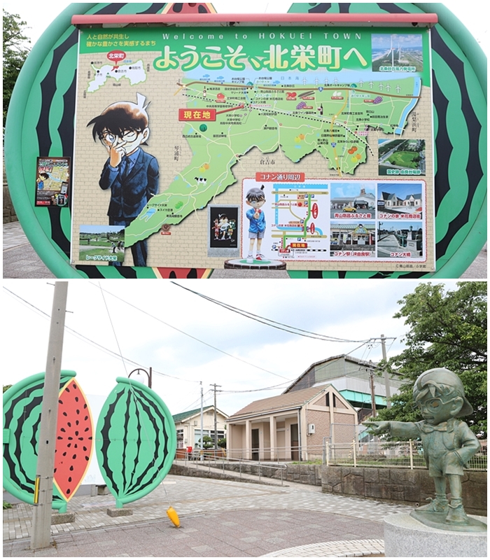 | 車站口就有超大的柯南公仔跟大家打招呼,依然是國小柯南最招牌的打招呼姿勢,一旁還有北榮町的地圖,裡面的指標都很重要,柯南幾乎是遍佈了這個小鄉鎮一偶,北榮町似乎也是盛產西瓜的地方。 |