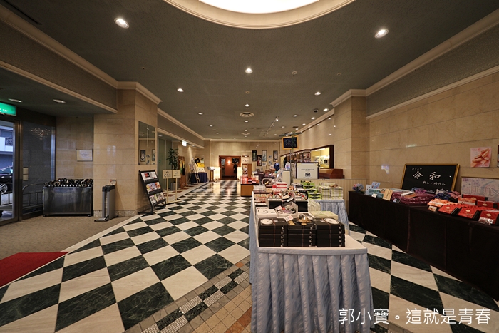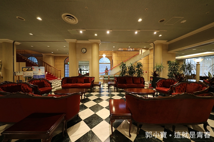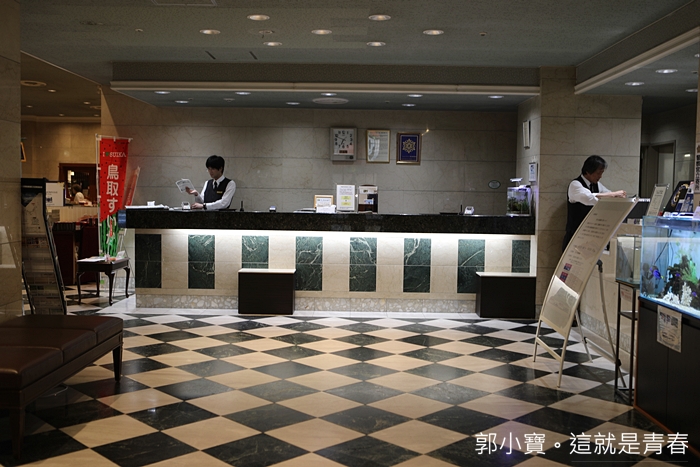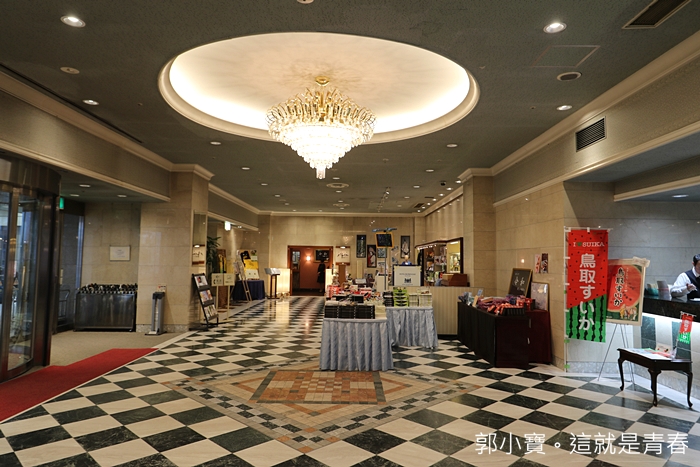 | ホテルモナーク鳥取、摩那趣鳥取酒店 大廳非常氣派,挑高的空間加上超美的水晶吊燈,黑白格的大理石地板,妥妥的五星飯店真的非常豪華。飯店整個一樓空間都是公共空間,超級大的,當天入住的時候,還有很多當地的公司型號都在這邊舉辦宴會。 |