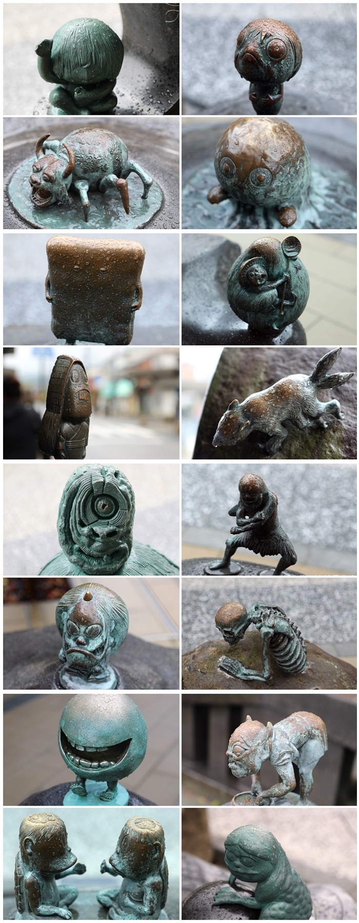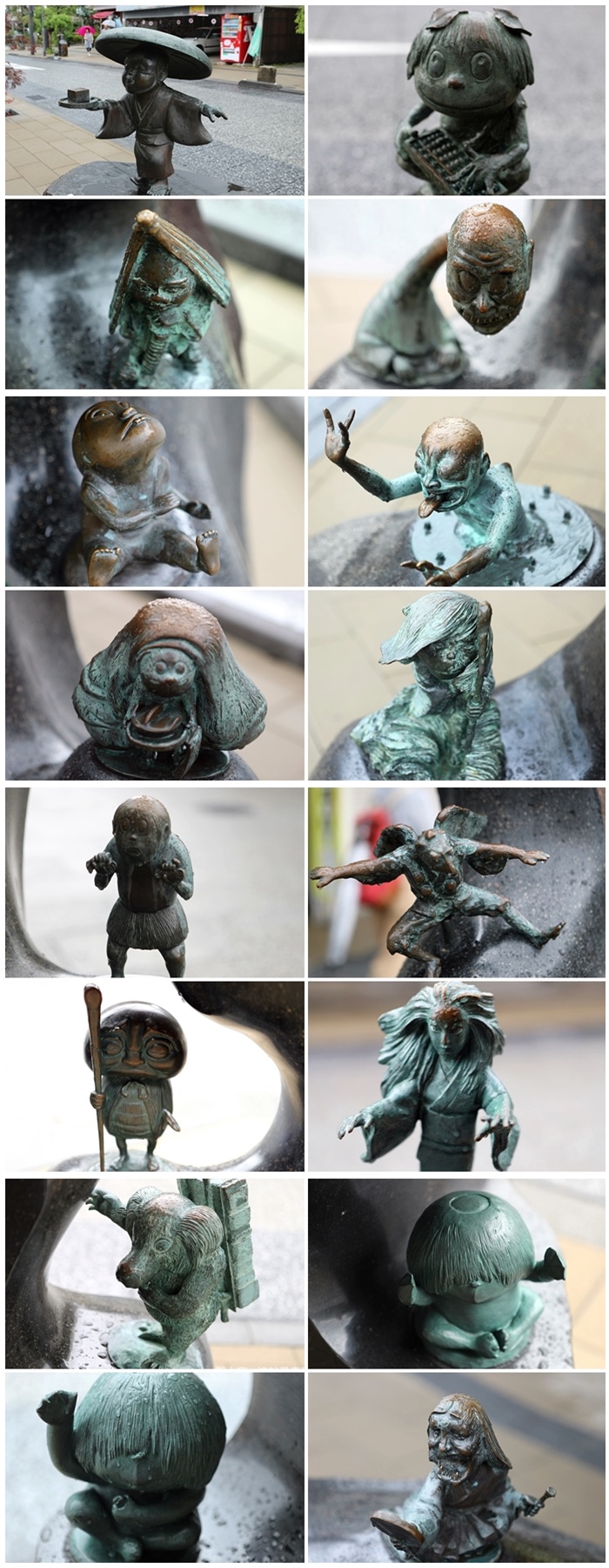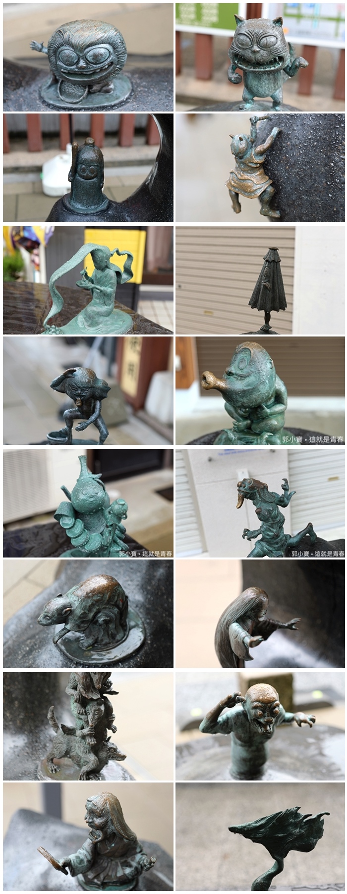 | 水木茂大道沿路上都有鬼太郎漫畫裡面出現過的妖怪,每一個都是我的兒時回憶,有些還記得有些卻忘記了,比較少見的妖怪也都會出現在這裡,這邊並不是我平常熟悉的鬼婆婆、鼠男、貓女等妖怪,但是依稀都記得些許這些妖怪的模樣。 |